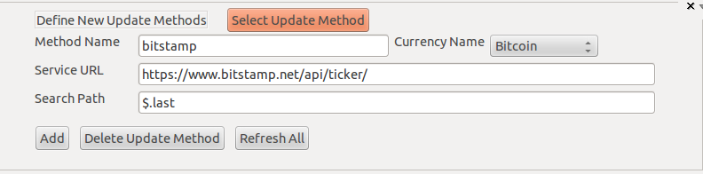 By default two currencies, Bitcoin BTC and US Dollar, are set up for you automatically and BTC is set up with one update methods for bitstamp.net and coinbase.com.